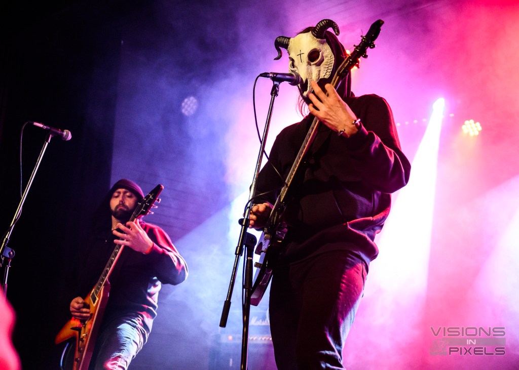 Our name refers to our mascot: a demonic prophet of doom nicknamed Shepherd, whose features are obscured by a goat skull mask. As the band’s version of the Antichrist, he’s accompanied by 12 demon goats who function as his disciples—THIRTEEN GOATS in total.